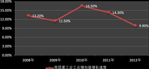 受到國際經(jīng)濟(jì)環(huán)境變動的影響,我國重工業(yè)在迎來高速發(fā)展期之后,其行業(yè)增速于2012年初開始有所放緩,呈現(xiàn)增長下滑的態(tài)勢,其主要的冶金礦山機(jī)械行業(yè)、物料搬運(yùn)設(shè)備行業(yè)、礦山機(jī)械行業(yè)等增長情況亦受到影響。