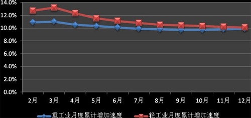 2012年我國重工業(yè)發(fā)展較為平穩(wěn),月度累計工業(yè)增加值增長率最高為3月的11%,最低為9月的9.7%。長期以來,我國重工業(yè)發(fā)展速度一直快于輕工業(yè)的發(fā)展速度,但受到內(nèi)外經(jīng)濟(jì)增速放緩、內(nèi)需不足等因素影響,2012年我國輕重工業(yè)發(fā)展出現(xiàn)倒置現(xiàn)象。2012年2月,我國輕重工業(yè)工業(yè)增加值月度累計增加速度為12.7%、10.9%,至12月則發(fā)展為10.1%、9.9%。整體上看,雖然我國重工業(yè)發(fā)展增長速度落后于輕工業(yè),但是其差距在逐步縮小。
