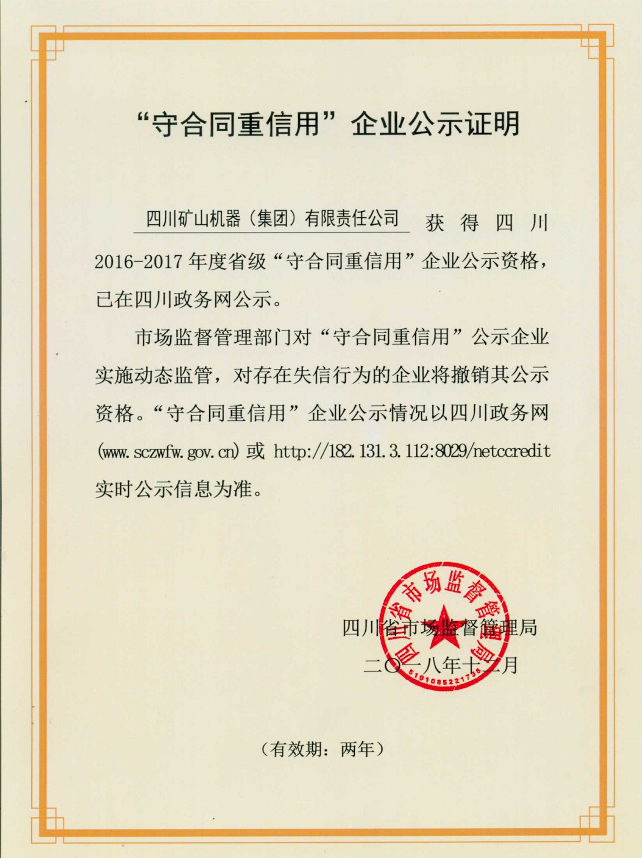 日前,四川省市場監(jiān)督管理局向社會公示了1294戶2016-2017年度省級“守合同重信用”企業(yè),我公司連續(xù)數(shù)年上榜。